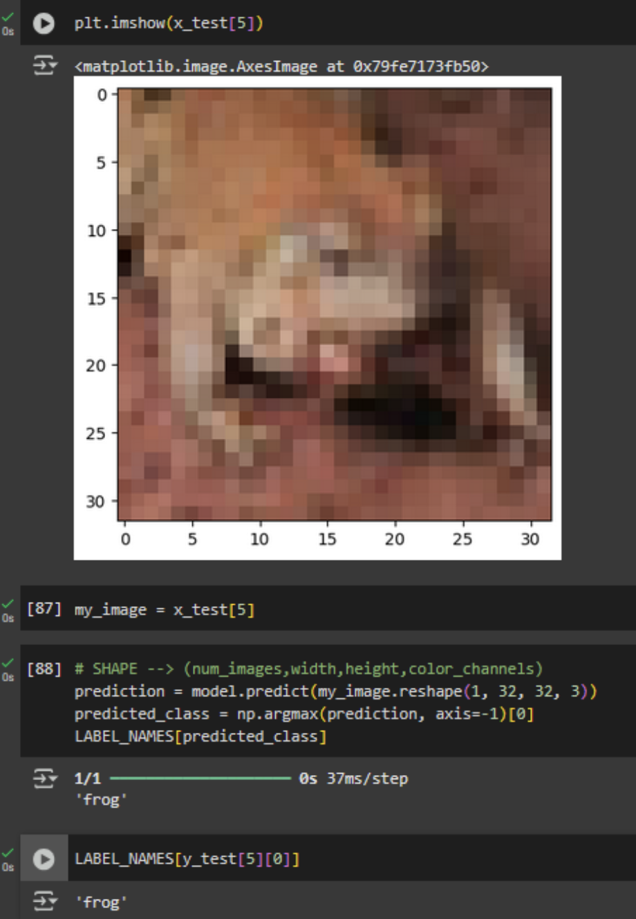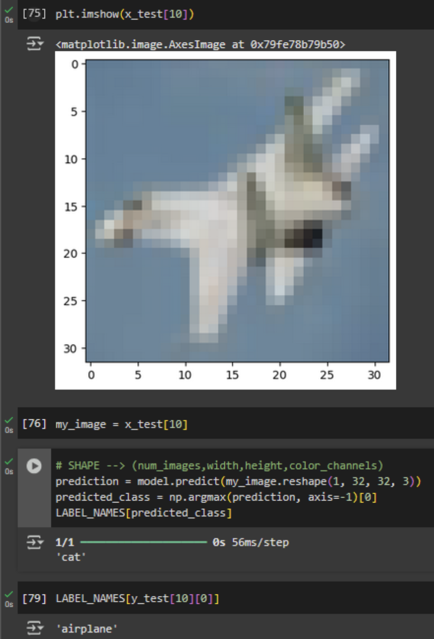 Testing the CNN model proved to be easy, albeit not without errors. I ran the code using Google Colab, and one of the cells quickly failed to run because, as I learned, the function used was part of an older version of TensorFlow. Because I was using Google Colab and my computer might not deal so well with the code, I decided to change the line as follows: