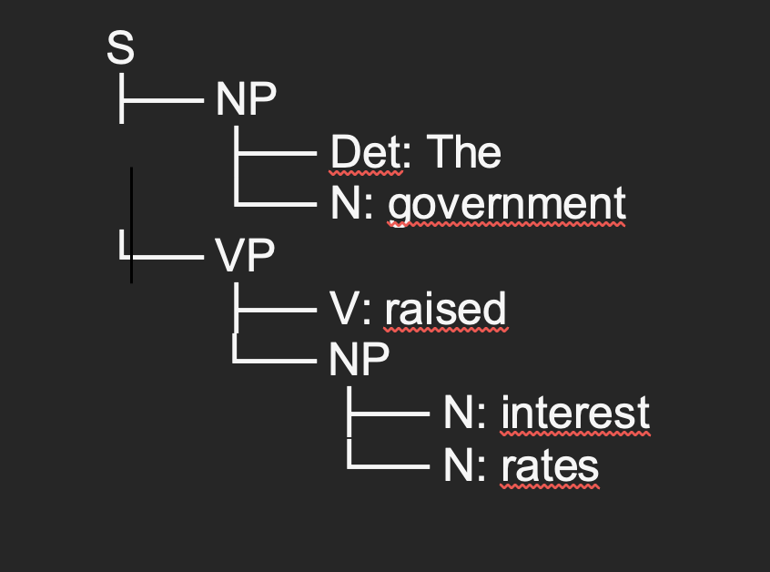 In the sentence “The government raised interest rates”, the structure can be represented as: