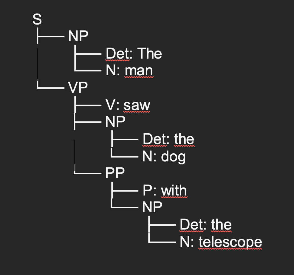 And for the last sentence, “The man saw the dog with the telescope”, which I interpreted as “The man looked at the dog through a telescope”, the structure looks like this: